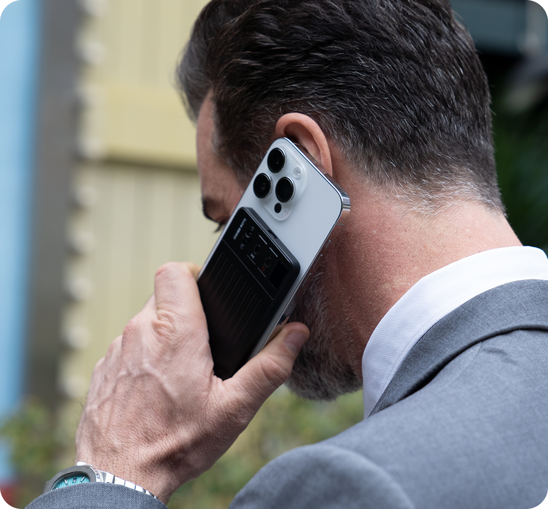 Chime Note securely attaches to your phone with its magnetic design and serves as a backup power source in emergencies, keeping you connected.